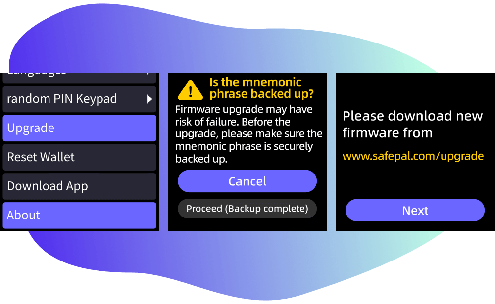 First of all, all SafePal hardware wallets are embedded with the firmware verification mechanism, which makes sure that any compromised or fake firmware cannot be properly upgraded into a SafePal hardware wallet.