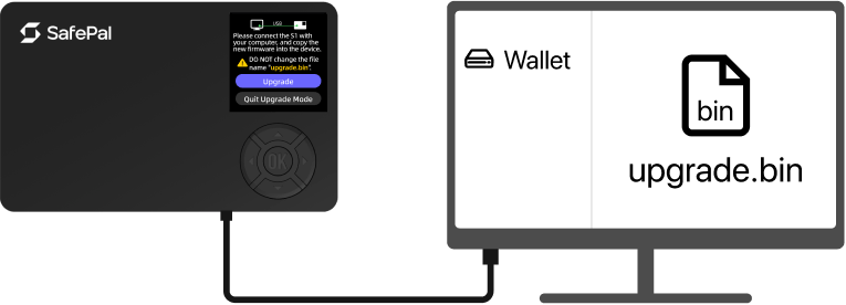 Drag the 'upgrade.bin' firmware file into the wallet virtual disk, and then click 'Upgrade' on the SafePal S1 Pro device. Then the device will start to upgrade. Wait for 1-3 minutes until it's upgrade. Finally you are good to go!